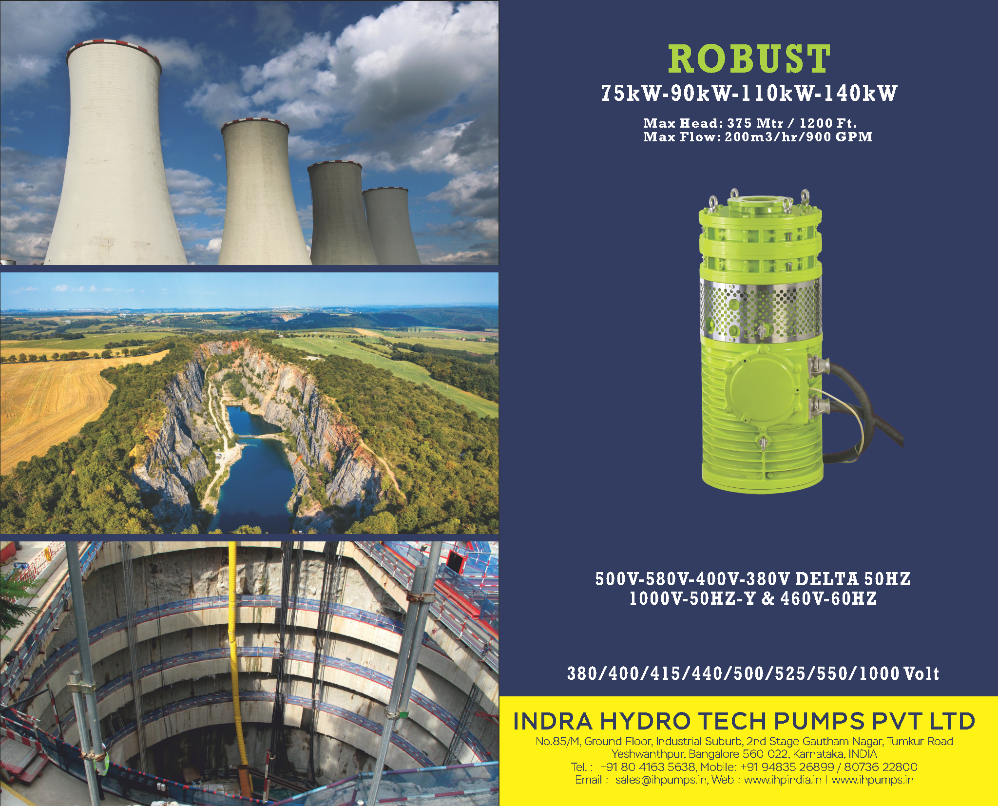 The Robust dewatering submersible pumps from IHP are designed for tough operating condition and suitable for mining, open cut mining, pit dewatering, industrial dewatering, deep well and quarry dewatering. It is two stage diffuser based system made of Stainless steel 316L both impeller and diffuser and longer life and no urethane or rubber lines parts and provides the long wear life which extends the efficiency of pumps. 50MM HO7RNF. cable are used for right power to the motor and Robust provides the specific features of Warrick moisture sensor mechanical seal and motor body and Motor body sensors protection 100% protection for operation easiness. It will handle the specific gravity of 1.03 as maximum and service factor of 1.15.